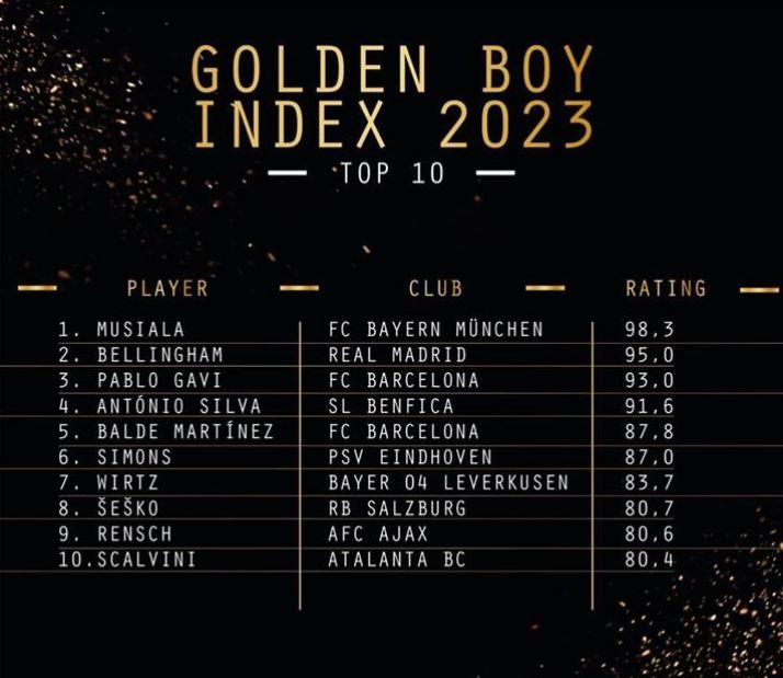 ظهر ضمن القائمة جود بيلينجهام لاعب ريال مدريد الجديد، بالإضافة إلى كل من أليخاندرو بالدي ظهير أيسر نادي برشلونة، واللاعب الألماني جمال موسيالا مهاجم فريق بايرن ميونخ، مع النجم الشاب جافي لاعب برشلونة الإسباني، في قائمة ضمن 10 أسماء، والتي جاءت كالآتي: