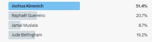 جاء في المنافسة في جوشوا كيميتش كل من رفائيل جاريرو وجود بيلينجهام ثنائي فريق بوروسيا دورتموند، بالإضافة إلى اللاعب جمال موسيالا نجم بايرن ميوني.