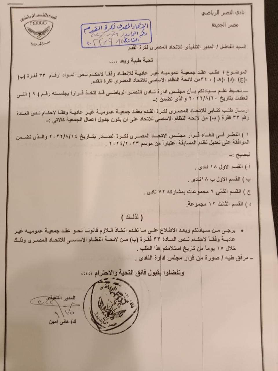 تقدَّمَ اليوم 50 ناديًّا من الأندية أعضاء الجمعية العمومية للاتحاد المصري لكرة القدم بطلب لعقد جمعية عمومية غير عادية، وفقًا للائحة النظام الأساسي اعتراضًا على قرار مجلس ادارة اتحاد الكرة بإقامة دوري المحترفين للقسم الثاني.