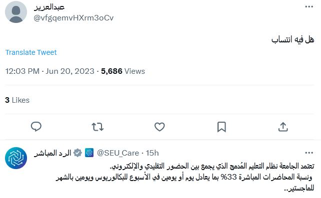 وورد للجامعة سؤال حول إمكانية الدراسة بنظام الانتساب، ليؤكد حساب "الرد المباشر" الخاص بالتواصل مع الطلاب والإجابة على أي استفسارات واردة للجامعة، ليجيب بأن الجامعة تعتمد نظام "التعليم المُدمج" الذي يجمع بين الحضور التقليدي والإلكتروني، ونسبة المحاضرات المباشرة 33% بما يعادل يوم أو يومين في الأسبوع للبكالوريوس ويومين بالشهر للماجستير.
