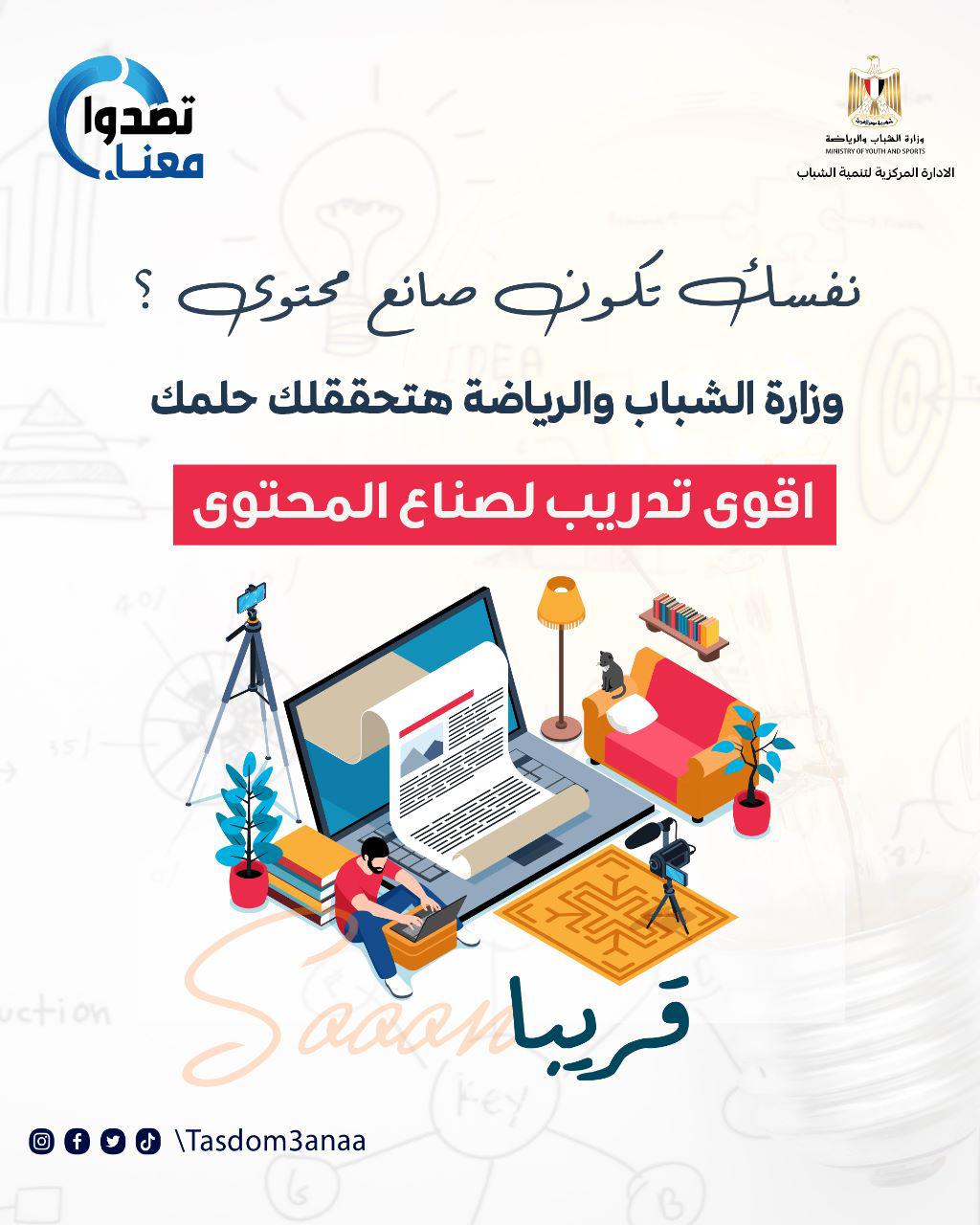 أعلنت وزارة الشباب والرياضة، من خلال الإدارة المركزية لتنمية الشباب - الإدارة العامة للبرامج الثقافية والفنية، بالتعاون مكتب معاون الوزير لتطوير القدرات الشبابية، عن إطلاق أول منحة تدريبية لإعداد جيل جديد من ُصنّاع المحتوى والارتقاء بمهاراتهم وإثراء حضورهم عبر الإنترنت، ومواقع التواصل الاجتماعي، بما يتيح لهم إحداث تأثير ملهم في مجالاتهم.