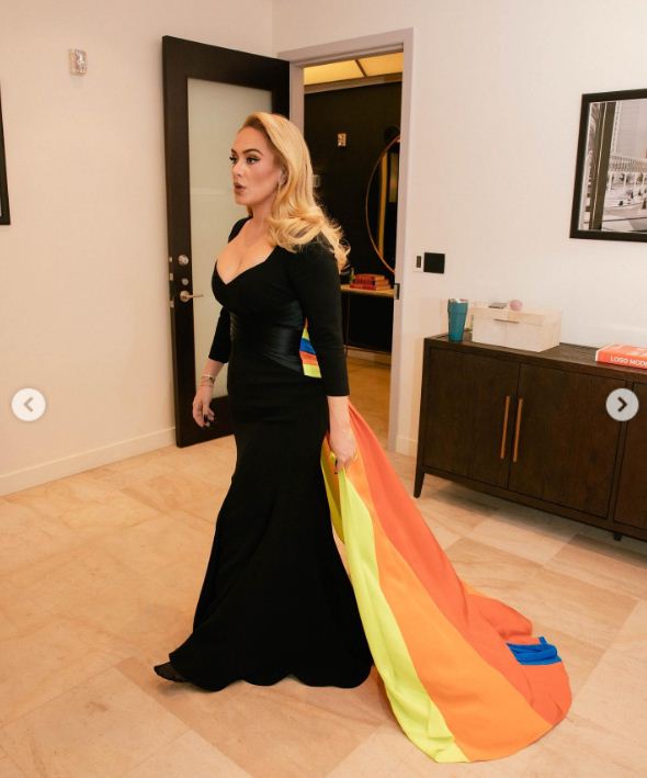 وظهرت أديل بفستان أسود مُجسم، وتميز بذيل طويل بألون قوس قزح، ليراه الجمهور العربي رسالة غير مباشرة بدعمها لمجتمع الميم.
