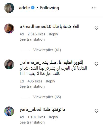 وعلقت مستخدمة على مواقع التواصل على إطلالة أديل عبر إنستجرام، كاتبة: "ما توقعتها منك!!"، فيما اعتبر آخر بأن هذا الأمر متوقع من أي شخصية مشهورة ولا سيما الأجانب منهم.