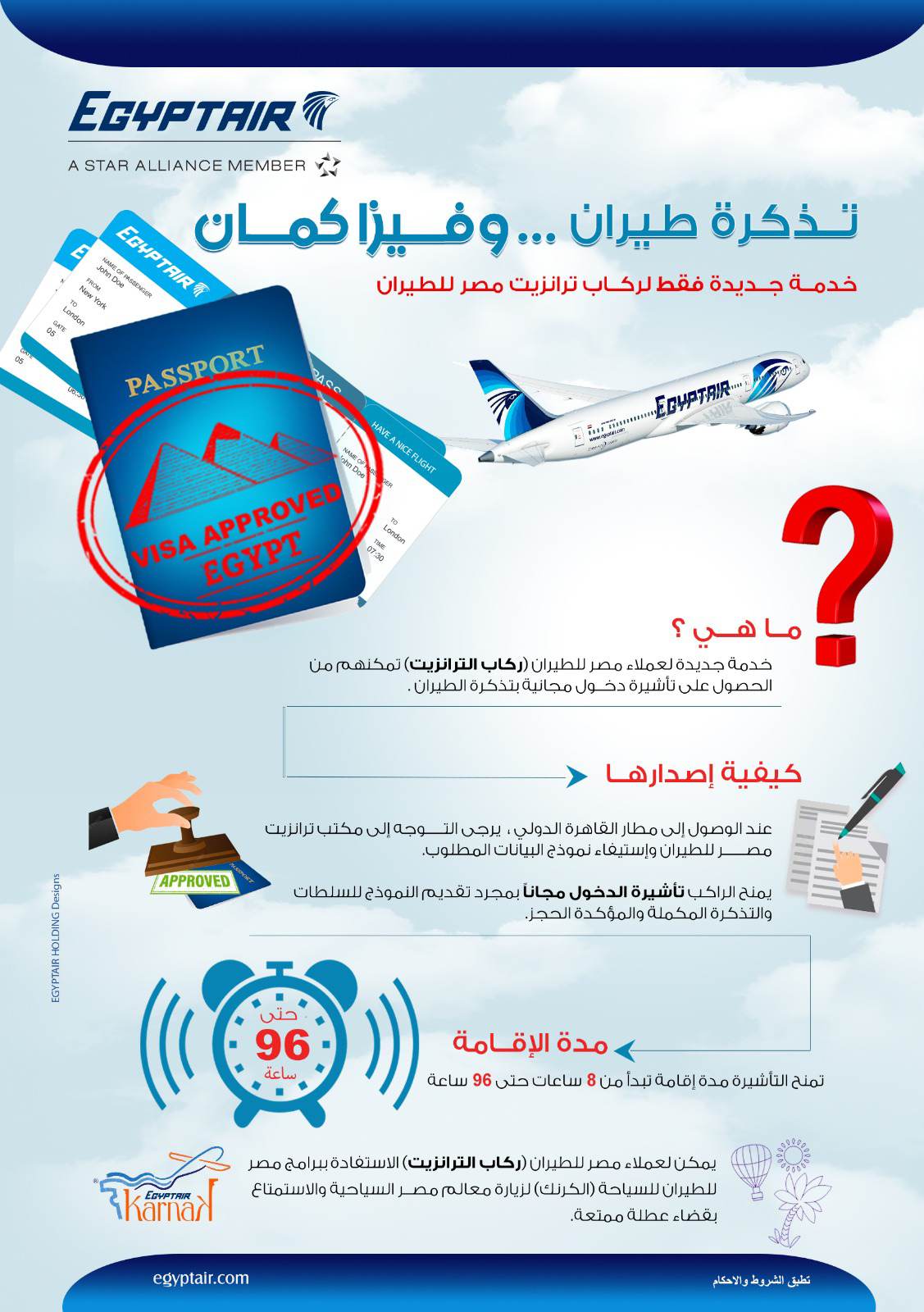 أعلنت مصر للطيران عن إمكانية الحصول على تأشيرة ترانزيت مجانية للدخول إلى جمهورية مصر العربية مدتها تبدأ من 8 ساعات إلى 96 ساعة ويمكن الحصول عليها عند الوصول إلى مطار القاهرة الدولى، على أن يتوجه الراكب إلى مكتب ترانزيت مصر للطيران بمطار القاهرة لاستيفاء استمارة البيانات التى بموجبها يتم الحصول على تأشيرة الوصول مجانًا من دون تحصيل أى رسوم مقابل تلك الخدمة.