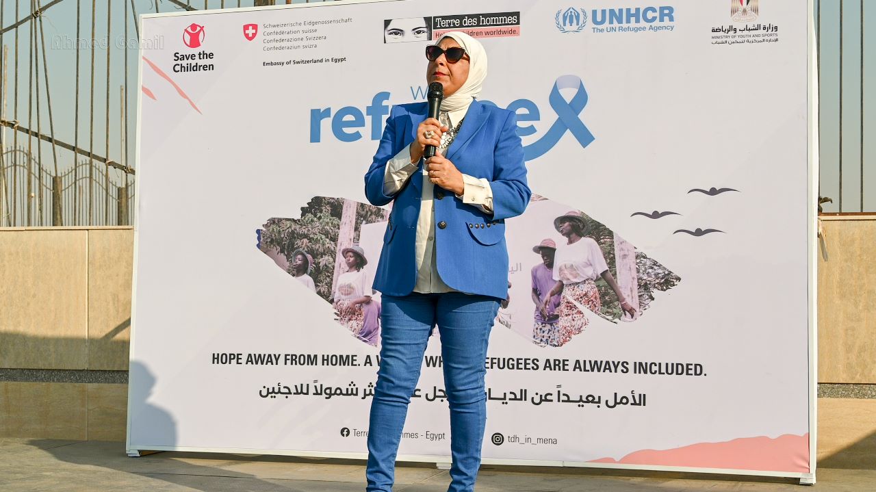وخلال كلمتها، نقلت  منال جمال رئيس الإدارة المركزية لتمكين الشباب تحيات الدكتور أشرف صبحي وزير االشباب والرياضة للحضور، وتهنئته باليوم العالمى للاجئيين، مشيرةً إلى أن الاحتفالية تاتى تتويجاً لتنفيذ العديد من البرامج والفعاليات الخاصة باللاجئين ومنها "المساحات الآمنة، والمراكز المجتمعية الرقمية"، والتي تسهم في تعليم المهارات الرقمية لإتاحة الفرصة للاجئين وتساعدهم في تفاعلهم مع المجتمع المصري.