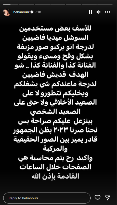 وتساءلت الفنانة السورية هبة نور، عن الهدف من نشر تلك الصفحات صور مزيفة لها، قائلة: شو الهدف.. أديش فاضيين.. لدرجة ماعندكن شي يشغلكن ويخليكم تتطوروا لا على الصيد الأخلاقي ولا حتى على الصعيد الشخصي، بينزعل عليكم صراحة بس نحنا صرنا 2023 بظن الجمهور قادر على التميز بين الصور الحقيقة والمزيفة .