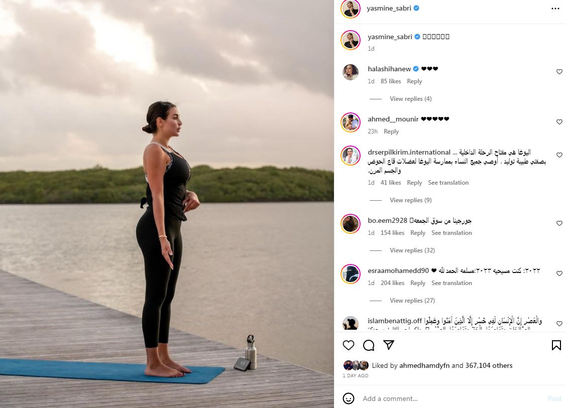 اعتادت الفنانة ياسمين صبري على ممارسة رياضة اليوجا لتحافظ على قوامها الرياضي الممشوق وهذا ما يزيد من نعومة إطلالاتها أمام متابعيها لتصبح مثال تقتدي به مع جمهورها.
