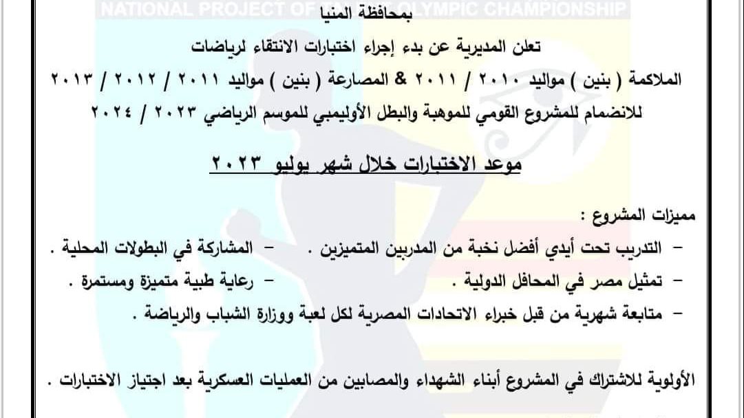 أعلنت مديرية الشباب والرياضة  بالمنيا، والإدارة العامة للرياضة، عن بدء إختبارات البراعم في لعبة الملاكمة بنين مواليد 2010- 2011، والمصارعة بنين مواليد 2011 - 2012 – 2013.