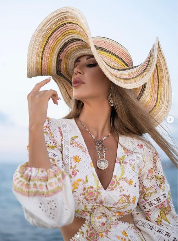 أما من الناحية الجمالية، اختارت ترك خصلات شعرها الذهبي الانسيابي منسدلة بحرية وراء ظهرها لتزينه بقبعه صممت من الخوص ووضعت مكياجًا ناعمًا مرتكزًا على الألوان الترابية مع تحديد عينيها بالكحل والماسكرا السوداء ولون الكشمير في الشفاه.