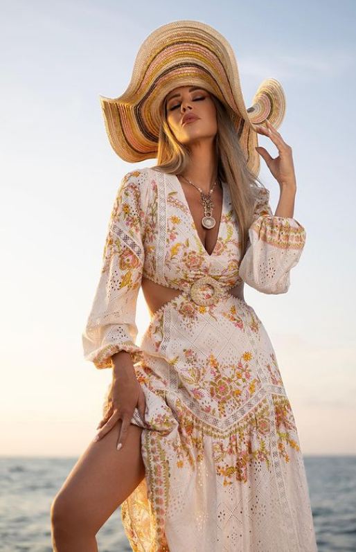 وتألقت كارلا حداد بإطلالة صيفية ناعمة مفعمة بالحيوية والجاذبية في آن واحد، من اختيار خبير الموضة Georges Chamoun، حيث ارتدت فستان طويل مجسم من اعلى وفضفاض من أسفل، مكشوف من جانبين للخصر، باكمام طويلة، صمم من قماش ناعم ذا ارضية بيضاء منقوش بالزهور الراقية، الفستان عكس قوامها الممشوق واكدت مواهبتها في استعراض رشاقتها كعارضات الأزياء.