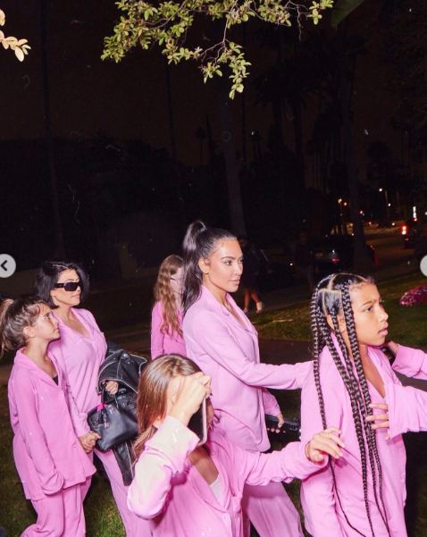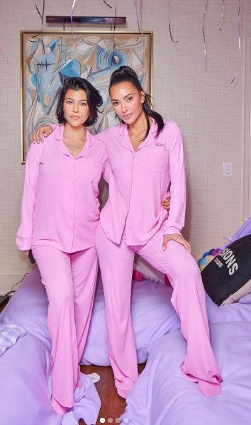 وظهرت كيم كارداشيان بإطلالة عفوية غلب عليها بالاحتشام، حيث ارتدت بيجامة حرير باللون البينك وهي برفقة عزيزتها.