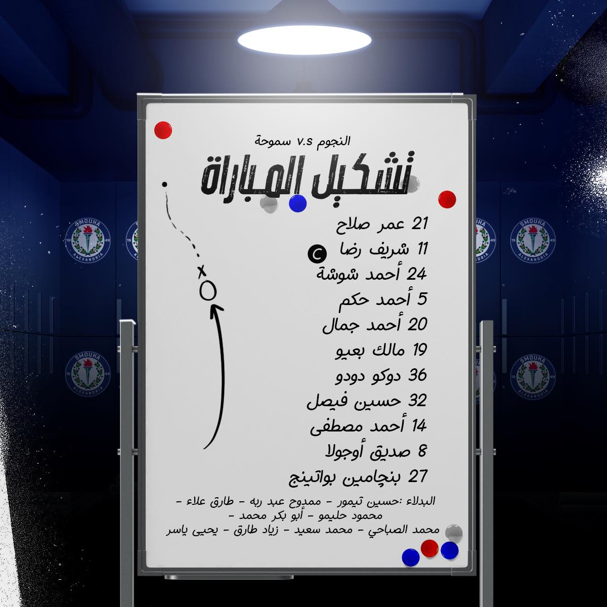 وجاء على مقاعد بدلاء سموحة امام النجوم في تشكيل اليوم كل من حسين تيمور و ممدوح عبد ربه و طارق علاء و محمود حليمو و ابو بكر محمد و محمد الصباحي و محمد سعيد و زياد طارق و يحيي ياسر.
