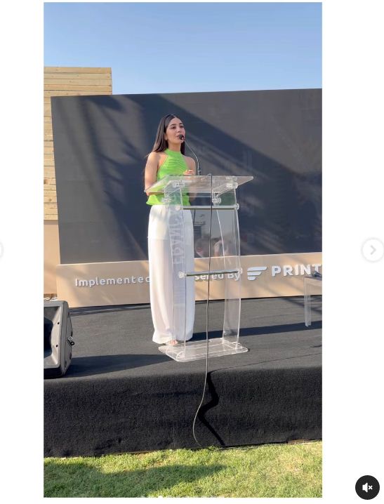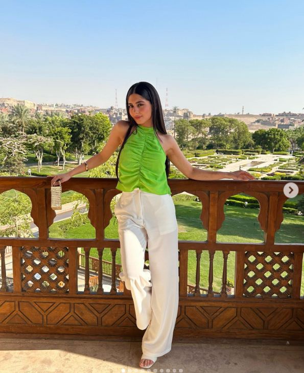 وبدت مايان بإطلالة جذابة ضمت بنطال أبيض ذا ساقين فضفاضتين، ونسقت عليه بلوزة باللون الأخضر الفاتح، مكشوفة الأكمام وتميزت بطيات متعددة من المنتصف؛ لتبرز رشاقتها وقوامها الممشوق.