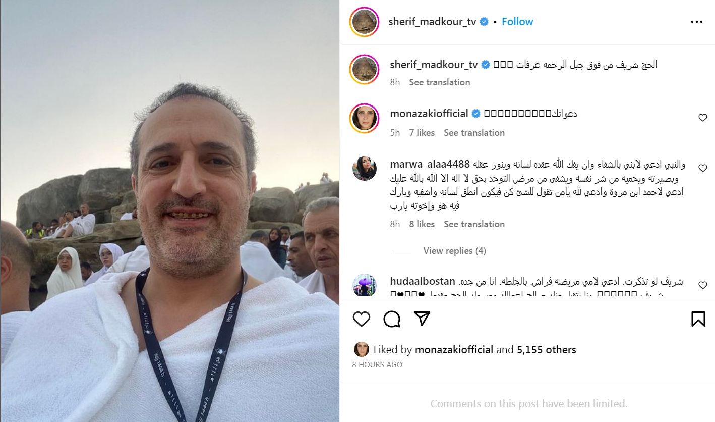 كتب شريف مدكور على صوره "الحج شريف من فوق جبل الرحمة عرفات، وحرص متابعوه على توصيته بالدعاء لهم ولذويهم، بجانب دعواتهم له.