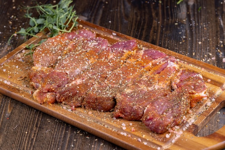 بهري اللحم بمزيج البهارات وبشكل جيد، وضعيه في الثلاجة لمدة ساعتين، ثم أخرجيه واشويه حتى يصبح لونه مائلاً إلى البني الغامق، ويُقدم ساخناً.