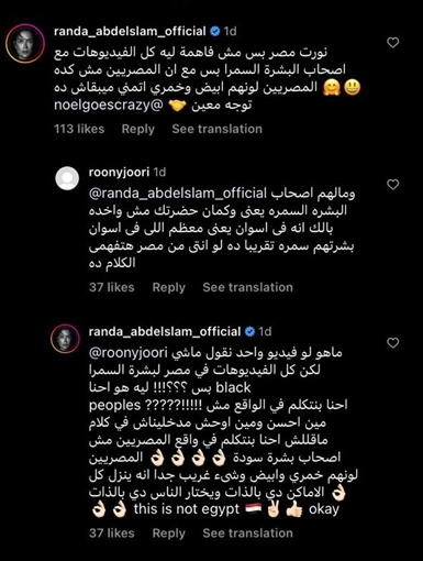 وكتبت راندا عبد السلام على الفيديو: "نورت مصر بس مش فاهمة ليه كل الفيديوهات مع أصحاب البشرة السمرا بس مع إن المصريني مش كدة. المصريين لونهم أبيض وخمري أتمنى ميبقاش توجه معين"، مضيفة: "لو فيديو واحد نقول ماشي لكن كل الفيديوهات في مصر لبشرة سمرا بس؟؟؟".