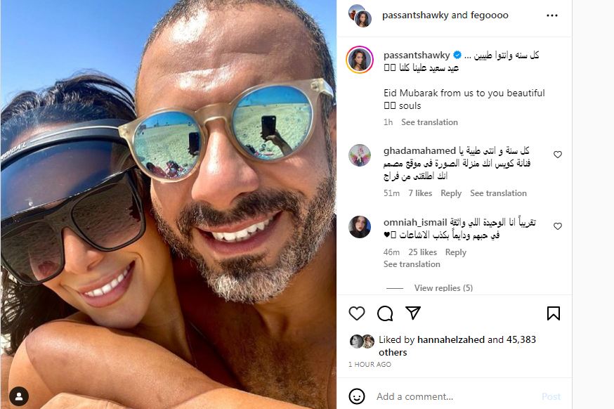 وعلقت بسنت شوقى على الصورة :"كل سنة وأنتو طيبين عيد سعيد علينا كلنا"، وكان الثنائي يستمتعان بأجازة عيد الأضحي المبارك على أحد الشواطئ.
