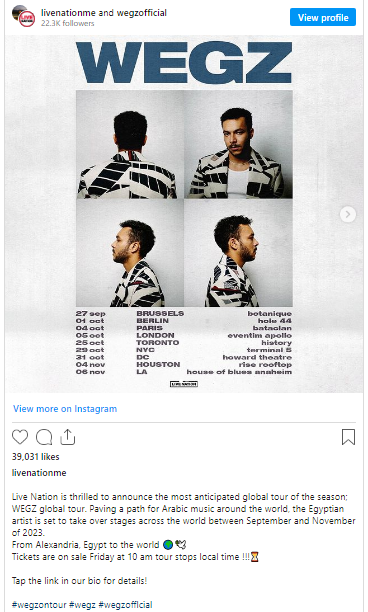 نشر مطرب الراب ويجز، صورة البوستر الرسمي للحفل، وأعلن عن موعد حفلاته في جميع أنحاء العالم، وذلك خلال منشور عبر حسابه الرسمي على موقع إنستجرام قائلًا: "الجولة العالمية المتوقعة لهذا الموسم، جولة WEGZ العالمية، تمهيدًا للموسيقى العربية في جميع أنحاء العالم".