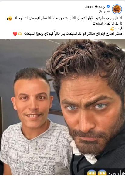 كتب الفنان تامر حسني، عبر صفحته قائلًا: "أنا هارون من فيلم تاج.. قولوا لتاج إن الناس بتتصور معايا أنا كمان أهوه مش انت لوحدك ونازلك أنا كمان السينمات قريب".
