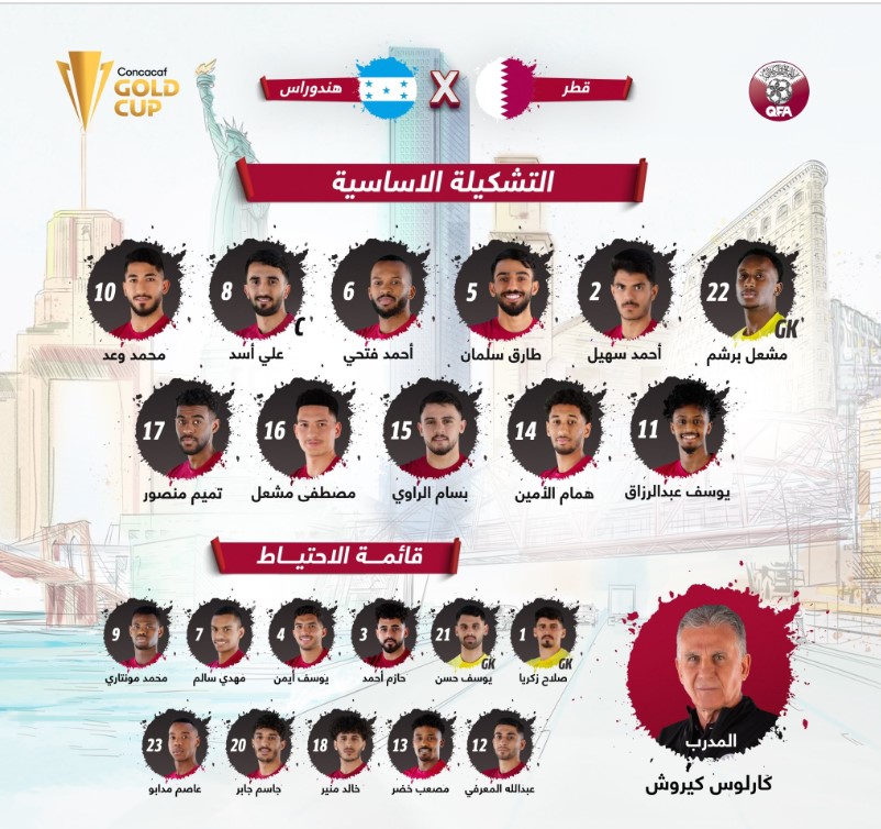 أعلن المدرب البرتغالي كارلوس كيروش المدير الفني لمنتخب قطر، تشكيل العنابي لمواجهة الهندوراس والتي تجمع الطرفين فجر اليوم الجمعة، على ملعب ستاد جامعة فينيكس في الولايات المتحدة الامريكية، ضمن مواجهات الجولة الثانية من مواجهات المجموعة الثانية بكأس الكونكاكاف.