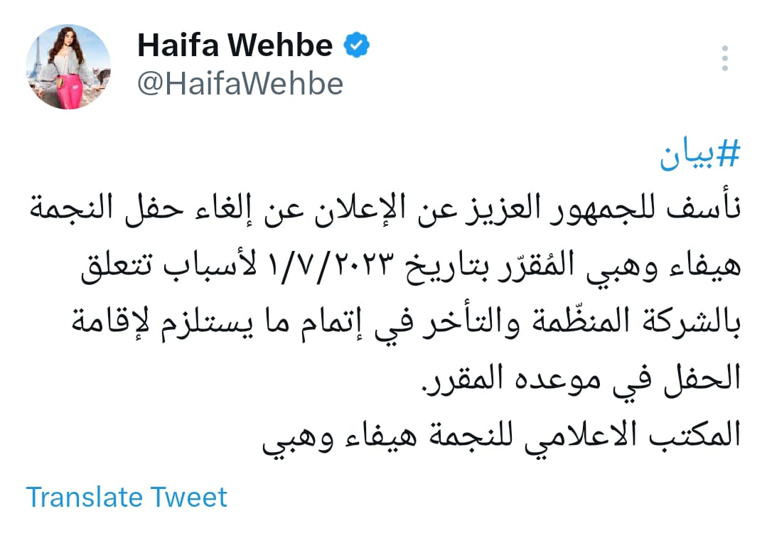 وكتبت صفحة هيفاء، قائلة : "نأسف للجمهور العزيز عن الإعلان عن إلغاء حفل النجمة هيفاء وهبي المقرر بتاريخ 1 يوليو، لأسباب تتعلق بالشركة المنظمة والتأخر في إتمام ما يستلزم في إقامة الحفل في موعده المقرر.
