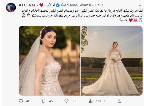 كتبت أحلام عبر حسابها الرسمي على موقع تويتر: "ألف مبروك لابنتي الغالية ماريتا حلاني بنت الفنان الكبير أخي وصديقي الفنان الكبير عاصي الحلاني والغالي عريس بنتي كميل ومبروك يا أم العروسة ومبروك يا أم العريس وربي يتمم بالفرح والحب سعادتكم بحبك".
