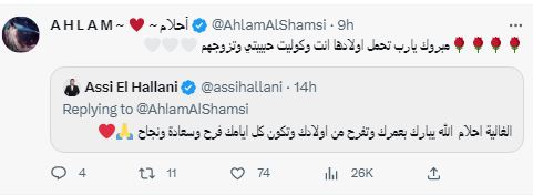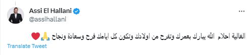 وغرّد الحلاني قائلًا لها: "الغالية أحلام الله يبارك بعمرك وتفرح من أولادك وتكون كل أيامك فرح وسعادة ونجاح".