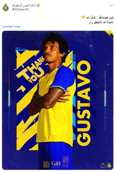 ونشر الحساب الرسمي لنادي النصر على موقع التدوينات القصيرة تويتر، صورة للاعب لويس جوستافو موجهًا الشكر له وعلى ما قدمه للفريق خلال الفترة الماضية، وعلق قائلًا: "لويس جوستافو.. شكرًا لك، أمنياتنا لك بالتوفيق".