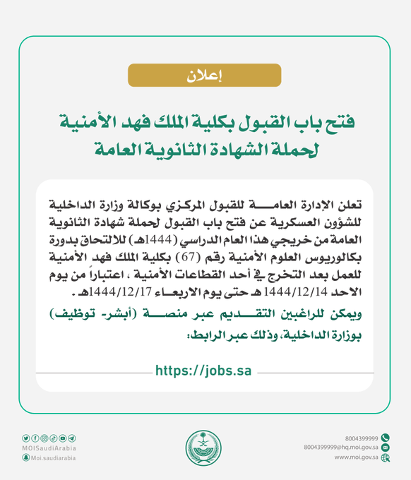 كلية الملك فهد الأمنية..بدء التقديم بدورة بكالوريوس العلوم الأمنية لحملة الثانوية 1444