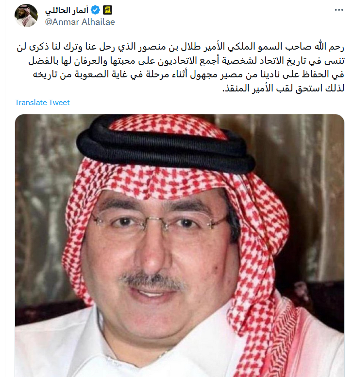 فيما نعاه أنمار الحائلي رئيس مجلس ادارة مؤسسة نادي الاتحاد السعودي عبر حسابه الرسمي بموقع التواصل الاجتماعي "تويتر"، وعلق:" رحم الله صاحب السمو الملكي الأمير طلال بن منصور الذي رحل عنا وترك لنا ذكرى لن تنسى في تاريخ الاتحاد لشخصية أجمع الاتحاديون على محبتها والعرفان لها بالفضل في الحفاظ على نادينا من مصير مجهول أثناء مرحلة في غاية الصعوبة من تاريخه لذلك استحق لقب الأمير المنقذ".