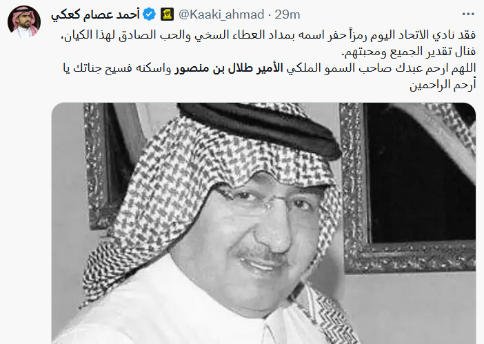 كما ودعه أحمد كعكي نائب رئيس نادي اتحاد جدة السعودي مغردًا:" فقد نادي الاتحاد اليوم رمزاً حفر اسمه بمداد العطاء السخي والحب الصادق لهذا الكيان، فنال تقدير الجميع ومحبتهم. .اللهم ارحم عبدك صاحب السمو الملكي الأمير طلال بن منصور واسكنه فسيح جناتك يا أرحم الراحمين".