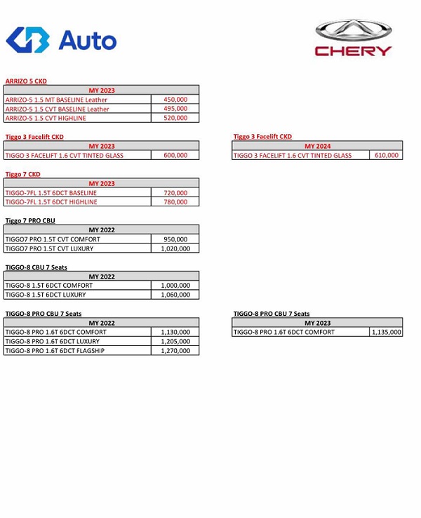 وشهدت قائمة أسعار سيارات شيري الصادرة عن مجموعة جي بي غبور أوتو، زيادات جديدة على أسعار سيارات شيري المجمعة محليًا فقط موديل 2023 وهى "أريزو 5 – تيجو 3 – تيجو 7" وثبات أسعار سيارات شيري المستوردة المتوافرة في السوق المصرية وهى “تيجو 7 برو – تيجو 8 – تيجو 8 برو”.