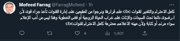 اجتاحت مواقع التواصل الاجتماعي حالة من الجدل والغضب سببتها الإعلامية رضوى الشربيني، بعد أن كتبت تغريدة على حسابها الشخصي على موقع تويتر، مسيئة للرجال، الأمر الذي جعل مجموعة قنوات cbc تحول رضوى الشربيني للتحقيق.