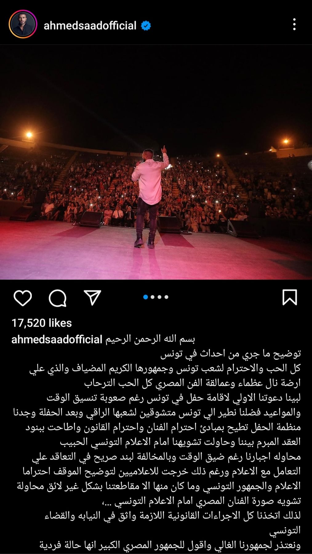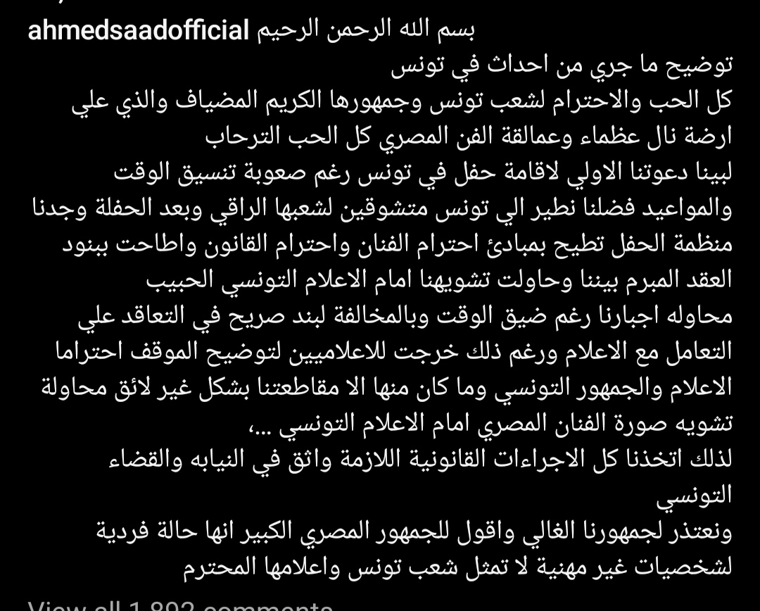 أشار أحمد سعد من خلال منشورا له عبر صفحته الرسمية بموقع التواصل الإجتماعي "انستجرام"، جاء فيه: "بسم الله الرحمن الرحيم.. توضيح ما جرى من أحداث في تونس، كل الحب والاحترام لشعب تونس وجمهورها الكريم المضياف، والذي على أرضه نال عظماء وعمالقة الفن المصري كل الحب والترحاب".