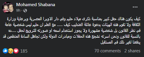 وتابع محمد شبانة، نجل شقيق عبد الحليم حافظ: «ده بالنسبة للقانون ونحن أسرته نشجع هذه الحفلات ومبادرات الدولة، ولكن تجاهل السادة المنظمين قد يدفعنا لغير ذلك في المستقبل».