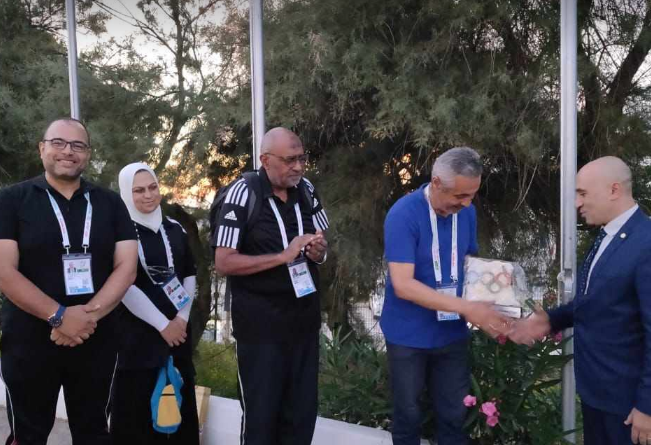 وقام الأستاذ محمد عبدالمقصود بإهداء درع اللجنة الأولمبية المصرية لعمدة قرية إقامة البعثات المشاركة خلال مراسم رفع علم مصر.