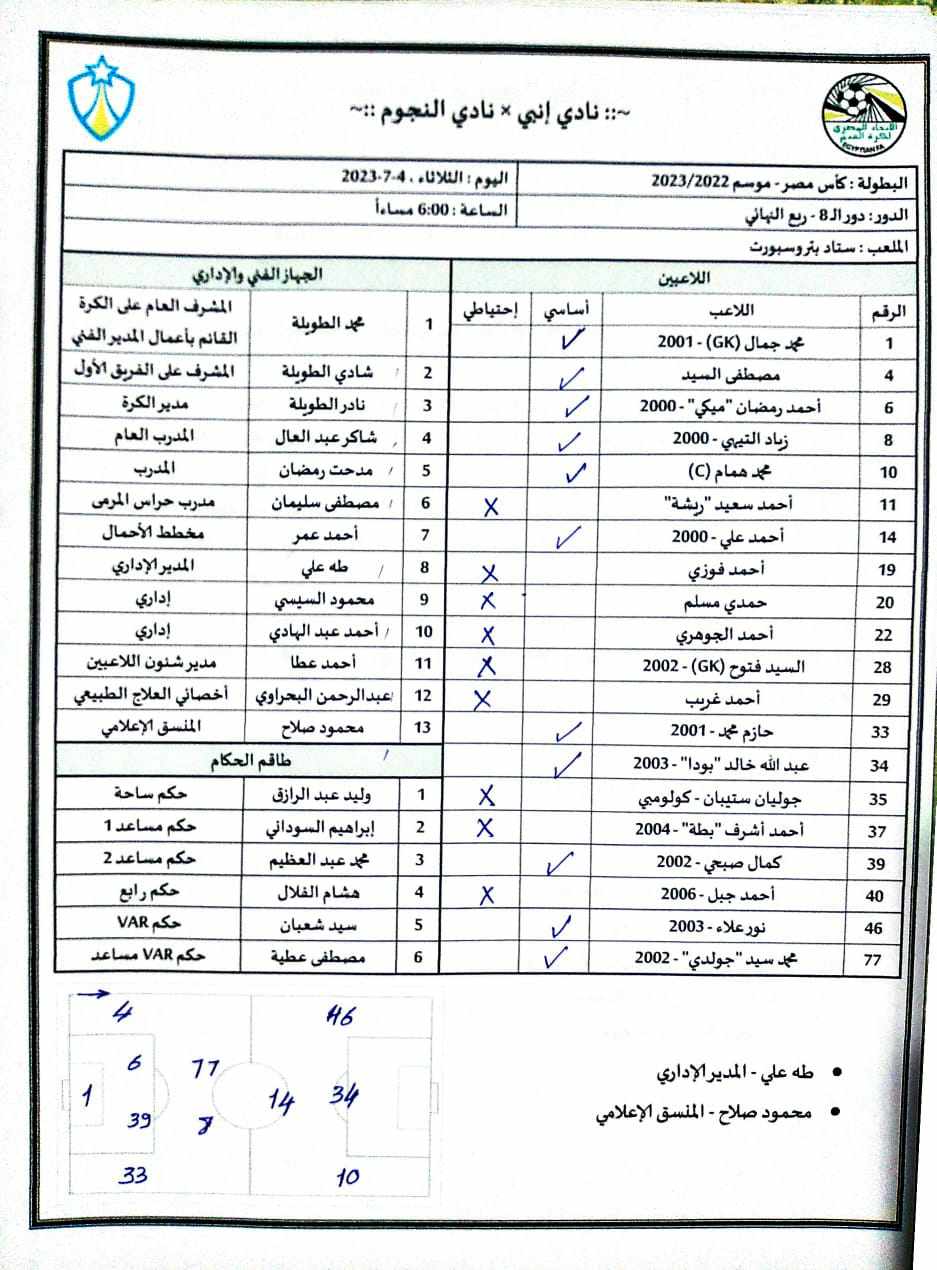 أعلن نادي النجوم بشكل رسمي عبر حسابه الرسمي بمواقع التواصل الاجتماعي عن تشكيل فريقه في مواجهة نامي انبي في دور ال8 بمسابقة كاس مصر .