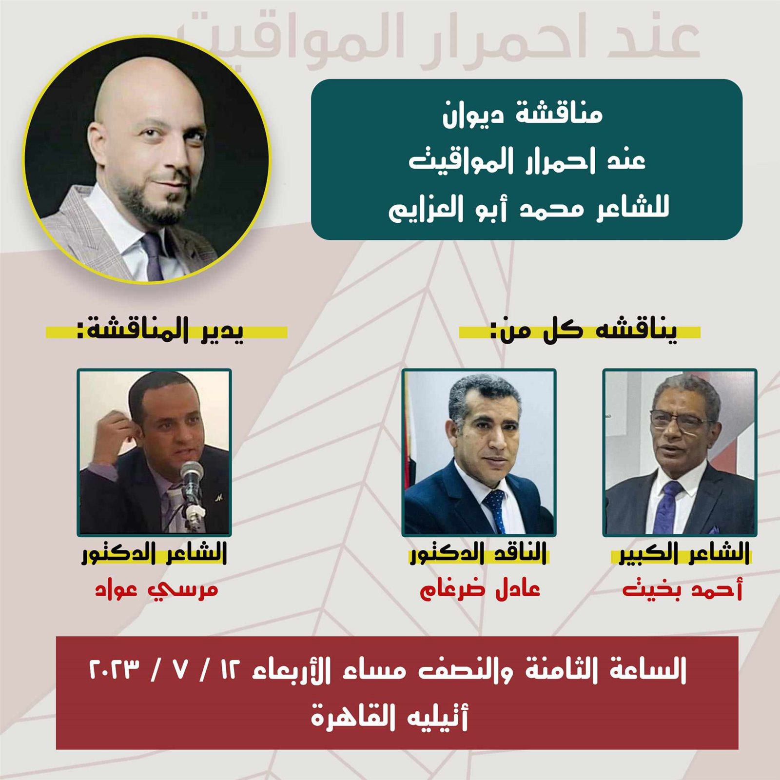 يستضيف أتيليه القاهرة، في الثامنة والنصف مساء يوم الأربعاء الموافق 12 يوليو، ندوة لمناقشة ديوان (عند احمرار المواقيت) للشاعر محمد أبوالعزايم.