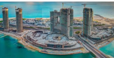 تحتوي المدينة على 15 برجا بارتفاع 100 متر فوق سطح البحر بتكلفة 28 مليار جنيه وتتميز المنطقة بوقوعها على شاطئ البحر المتوسط مباشرة، إلى جانب أطول ممشى سياحي عالمي على شاطئ البحر بطول 14 كيلومترا يعادل كورنيش مدينة الإسكندرية.