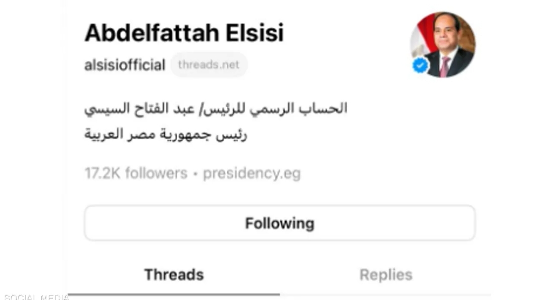 وظهر حساب للرئيس عبد الفتاح السيسي، على منصة التواصل الاجتماعي الجديدة "ثريدز"، ويحمل علامة التوثيق الزرقاء، ليحصد الحساب أكثر من 17.2 ألف متابع عقب إعلان الرئاسة المصرية تدشين صفحته بساعات.