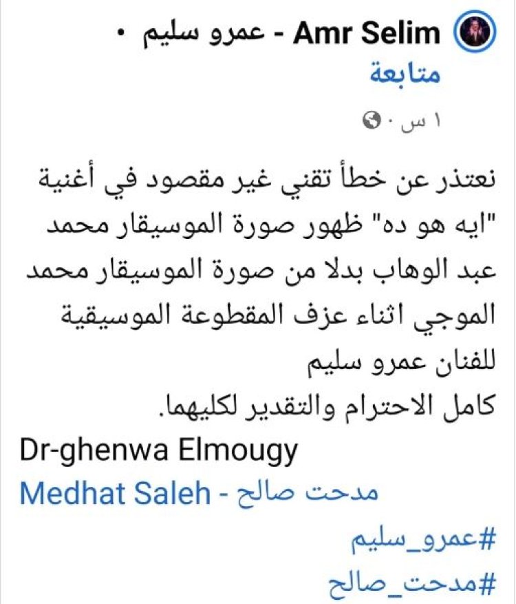 وكتب عمرو سليم عبر صفحته، قائلا: “نعتذر عن خطأ تقني غير مقصود في أغنية ايه هو ده، وظهور صورة الموسيقار محمد عبد الوهاب بدلاً من صورة الموسيقار محمد الموجي في أثناء عزف المقطوعة الموسيقية للفنان عمرو سليم.. كامل الاحترام والتقدير لكليهما”.