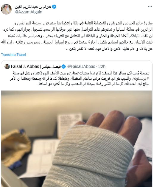 وغرد المواطن السعودي الذي تعرض لحادث السرقة باسبانيا، :"نصيحة مُحب لكل مسافر هذا الصيف: لا ترتدوا مقتنيات ثمينة. تعرضت اليوم لاعتداء ونشل في مدينة برشلونة، والسبب هو اني خرجت مرتديا ساعتي المفضلة".