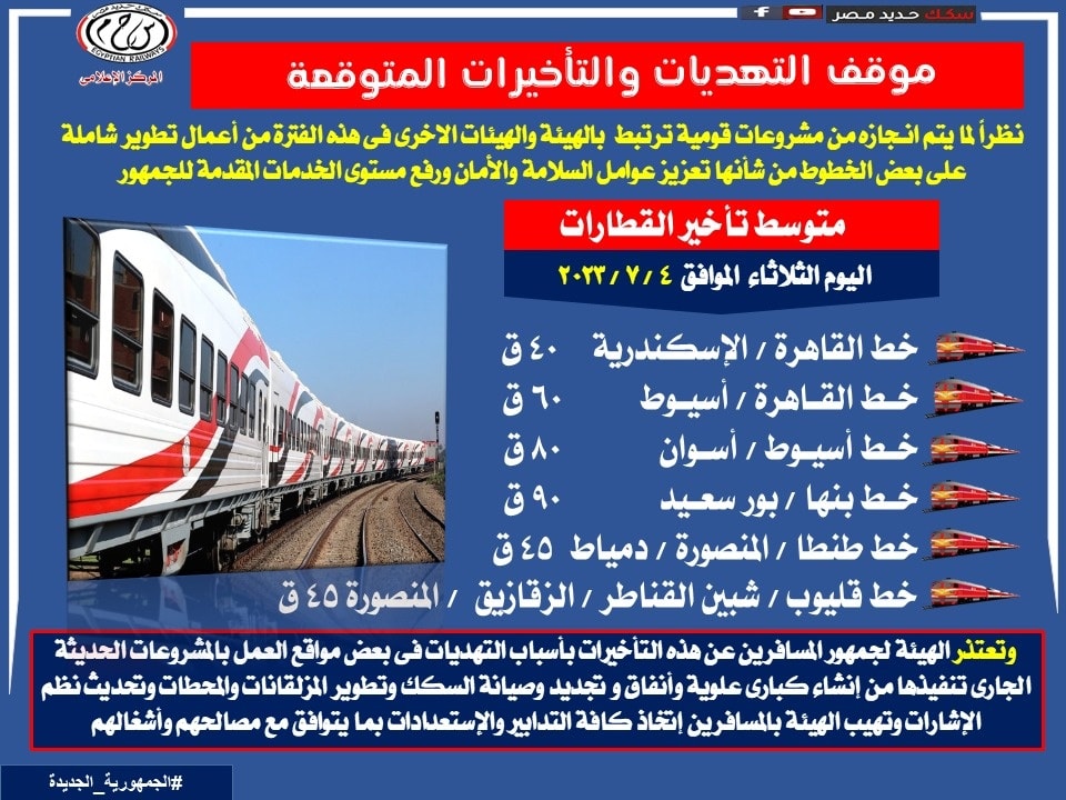 تأخيرات وتهدئات قطارات السكة الحديد.. واعتذرت الهيئة لجمهور المسافرين عن هذه التأخيرات بسبب التهديات في بعض مواقع العمل بالمشروعات الحديثة الجاري تنفيذها من تجديد وصيانة السكك، وتطوير المزلقانات والمحطات وتحديث نظم الإشارات، وأهابت الهيئة بالمسافرين اتخاذ التدابير والاستعدادات بما يتوافق مع مصالحهم وأشغالهم.