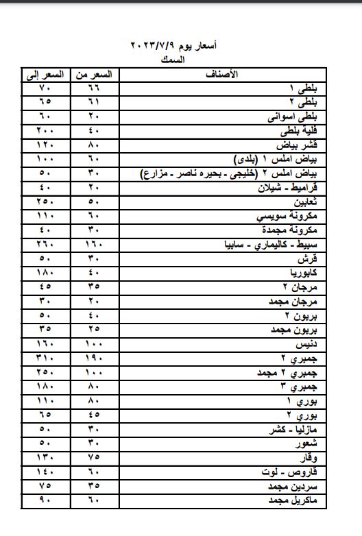 تواصل أسعار السمك في سوق الجملة بالعبور، اليوم الأحد 9 يوليو 2023 صعودها، حيث ارتفعت أسعار المكرونة السويسي والكابوريا والبوري مقارنة بنفس مستوياتها أمس، بحسب الموقع الرسمي لسوق العبور.