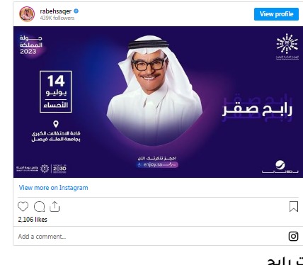 يروج المطرب رابح صقرلحفله المقبل بطريقة طريفة ، حيث شارك رابح جمهوره عبر حسابه الخاص على موقع تبادل الصور والفيديوهات "إنستجرام"،بصوره خاصة بالحفل وعلق عليها قائلا:" "جمهوري وأهلي في الأحساء، ألتقيكم يوم الجمعة. مشتاق لكم كثيراً يا حبايبي".
