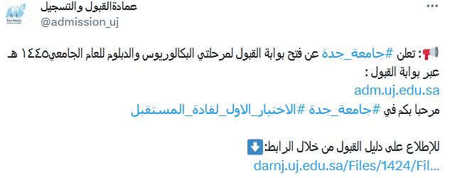 ولكل من يرغب في التقديم بجامعة جدة في العام الجامعي 1445هـ، عليه الاطلاع على كافة تفاصيل التقديم وقراءة دليل القبول بالضغط على الرابط التالي.. https://darnj.uj.edu.sa/Files/1424/Files/154900_DALIL.pdf