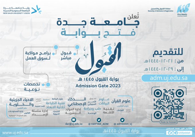 أعلنت عمادة القبول والتسجيل بجامعة جدة بالمملكة العربية السعودية أن التقديم مستمر على برامج القبول في الجامعة والتي تشمل المسار الصحي والقبول المباشر (كليات المسار العلمي)، والقبول المباشر (كليات المسار الانساني) والتسكين المباشر لكليات المسار الصحي (الطب-العلوم الطبية التطبيقية)، ودبلومات الكلية التطبيقية، والسنة التأهيلية برسوم دراسية.