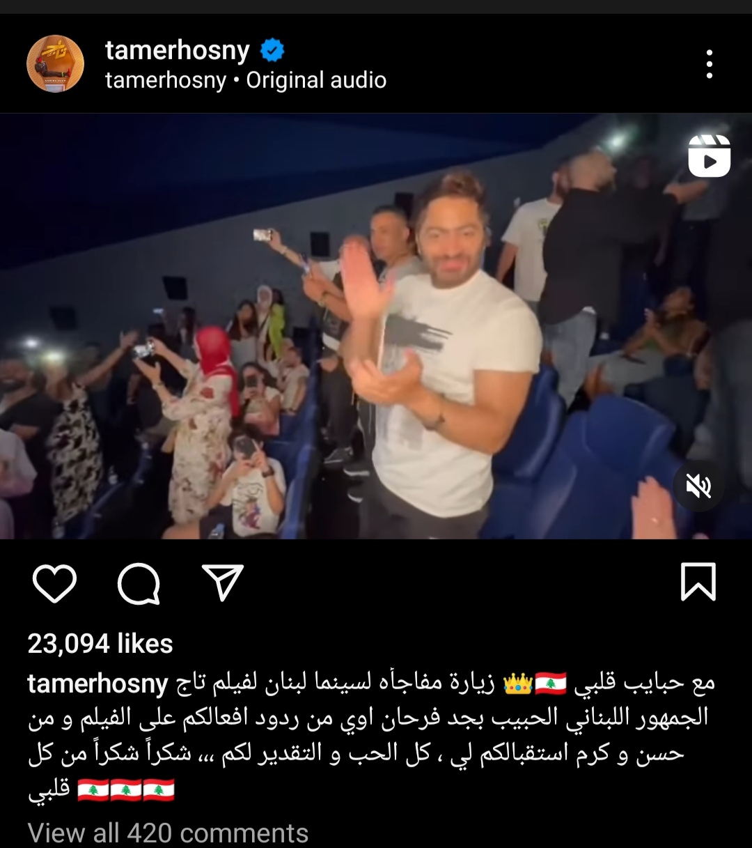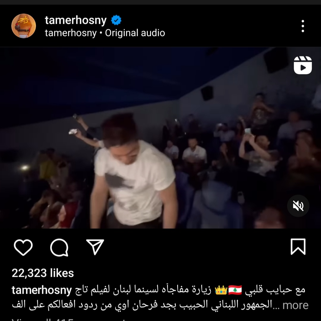 نشر تامر حسني فيديو جديد من خلال حسابه الشخصي عبر موقع تبادل الصور والفيديوهات "إنستجرام"، قائلا :" زيارة مفاجأة لسينما لبنان لفيلم تاج مع حبايب قلبي الجمهور اللبناني الحبيب، بجد فرحان اوي من ردود افعالكم على الفيلم ومن حسن وكرم استقبالكم لي، كل الحب والتقدير لكم، شكرا شكرا من كل قلبي.