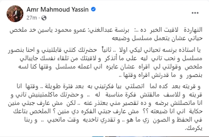 وأضاف عمرو محمود ياسين: "قريته بعد كده لما اتصلتي بيا فكرتيني به بعد فترة طويلة .. وقتها أنا قريته وللأسف ملقتش فكرة مناسبة له، وحضرتك ما كلمتينيش تاني وأنا ما تصلتش برضه وده تقصير مني بعتذر عنه، لكن مش عارف جبتي منين حكاية إني أنا ضيعته؟؟ مش عارف جبتي الفكرة دي منين؟ الملخص بتاعك في الحفظ والصون زي ما هو وتقدري تاخديه وقت ماتحبي .. وربنا يكرمك".