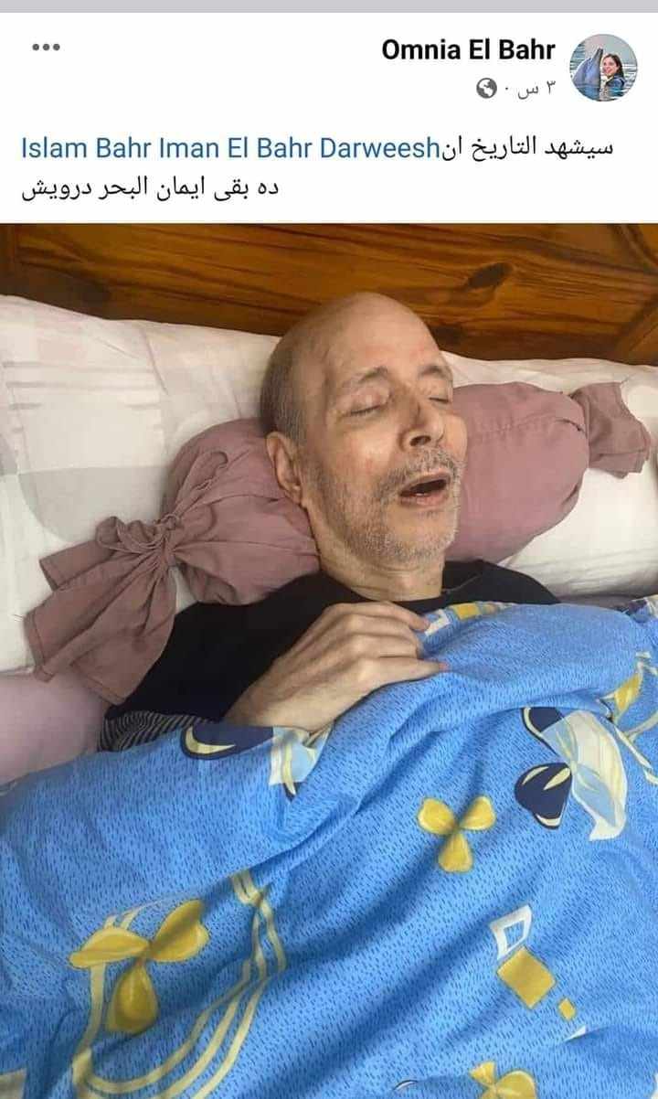 ونشرت ابنة الفنان إيمان البحر درويش، الصورة عبر حسابها الشخصي "فيس بوك" بتعليق: "سيشهد التاريخ، إن دا بقى الفنان إيمان البحر درويش"، مما دفع كل محبي الفنان القدير للدعاء له بالشفاء العاجل.